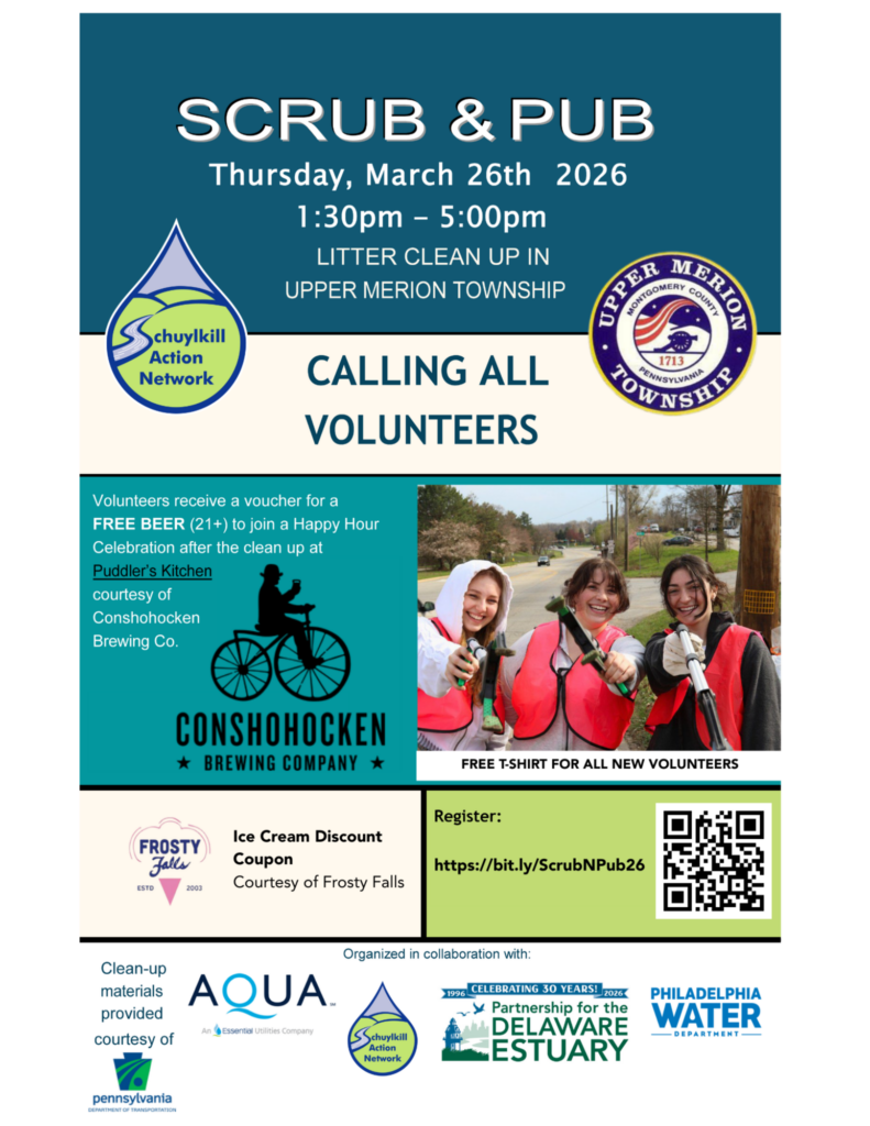 Join the Schuylkill Action Network and partners for a cleanup of Upper Merion Township’s streams & streets, and the Schuylkill River! The cleanup will be followed by a happy hour celebration at Puddler’s Kitchen and volunteers (21 & over) will receive a free beer!